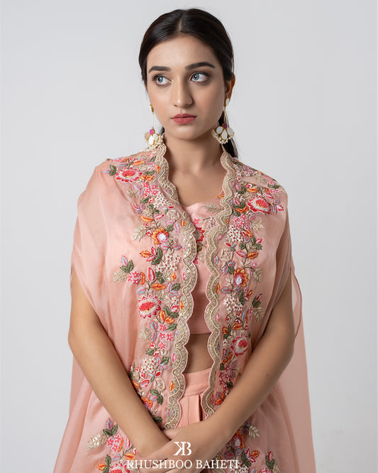 Peach Hand Embroidered Cape And Cowl Skirt Set