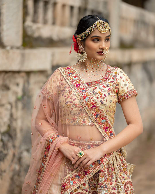 Almond Gold Bridal Lehenga Set With Multicolor Hand Embroidery