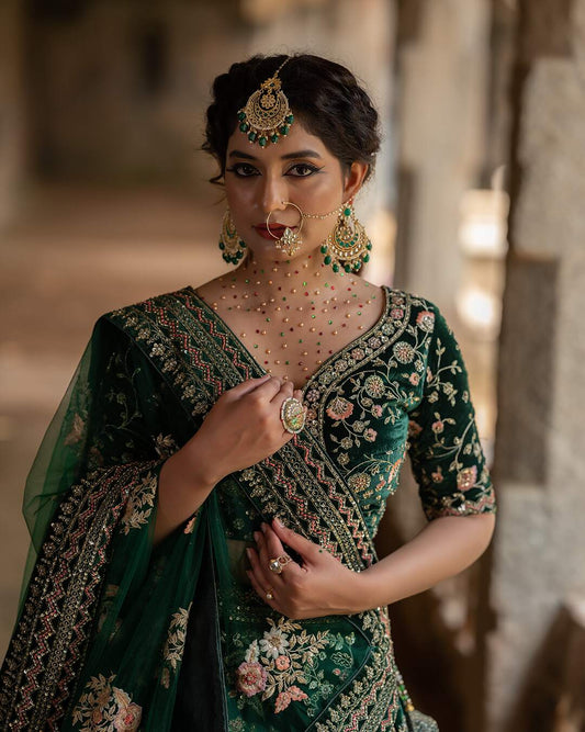 Bottle Green Velvet Mehndi Lehenga Set With Floral Hand Embroidery
