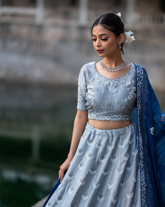 Hand Crafted Grey and Blue Pearl Embroidery Lehenga Set