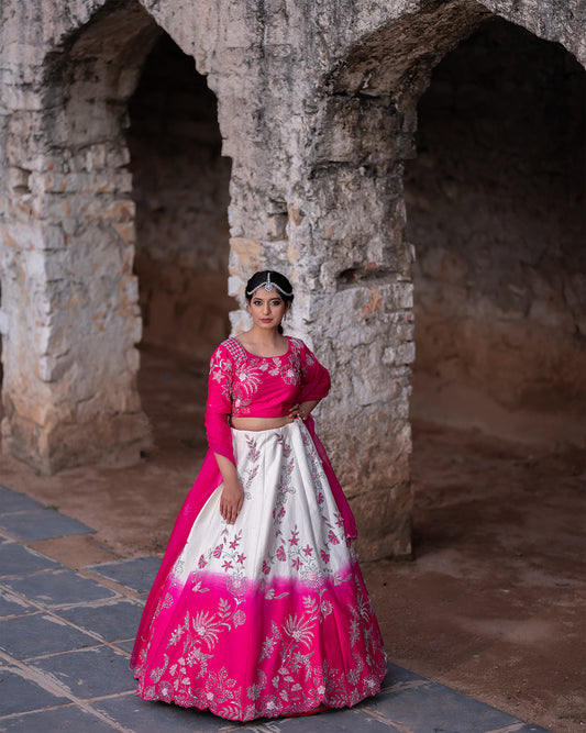 Shaded Hot Pink and White Sequin and Floral Lehenga Set