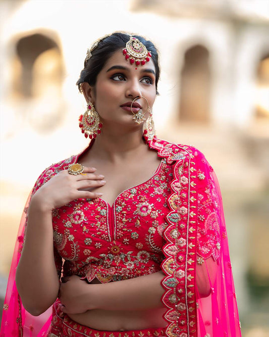 Reddish Pink Zardozi Embroidered with Threadwork Bridal Lehenga Set